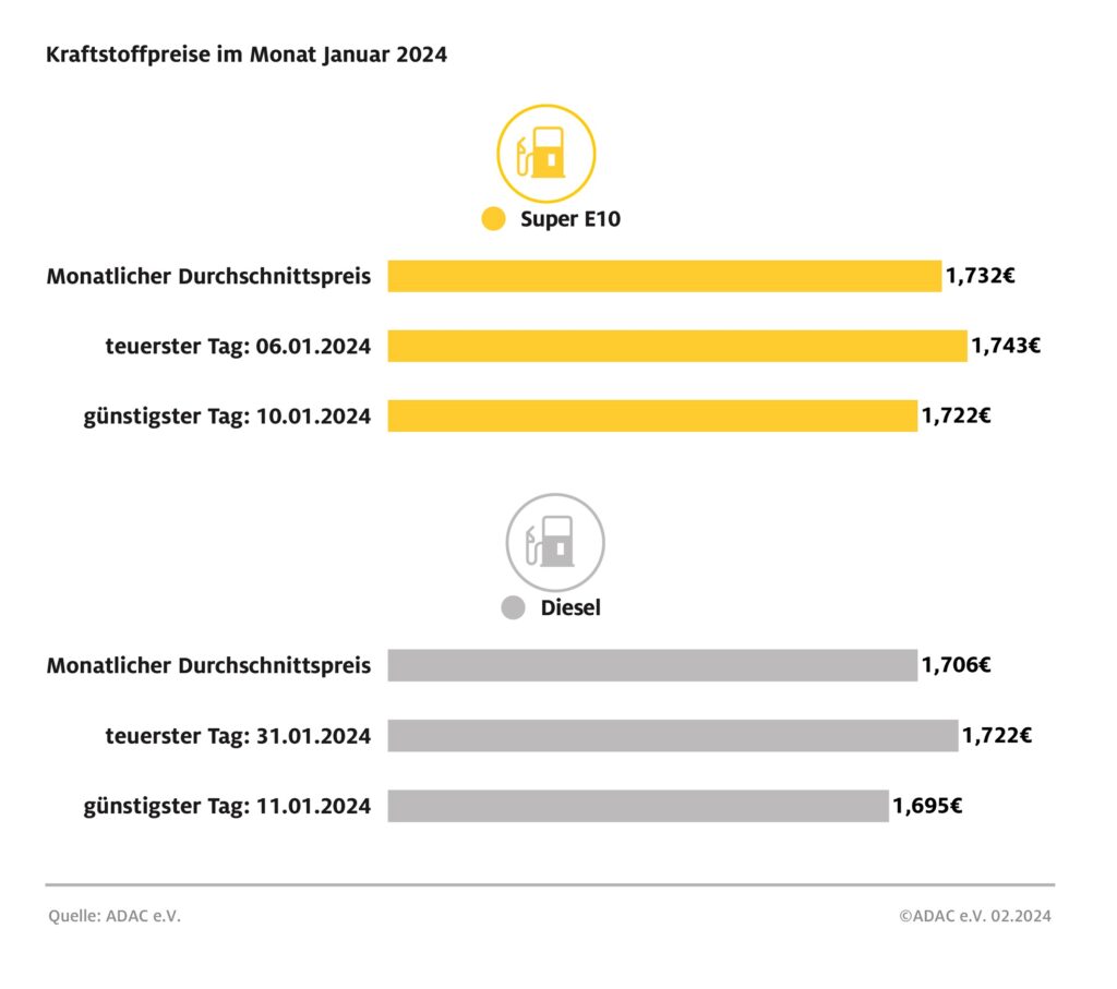 Tanken im Januar: Kaum Ausschläge bei den Preisen – ADAC Monatsbilanz zum Jahresbeginn: Super E10 kostete im Schnitt 1,732 Euro je Liter, Diesel 1,706 Euro